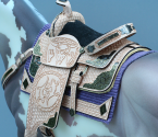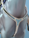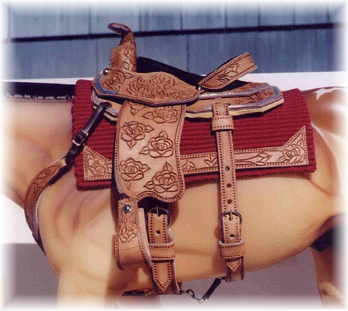This Southwestern themed set is sure to please, covered with ~50 new fancy Rio Rondo plates in a silver & black color theme. Natural color hand carved in a southwestern design and tooled basketweave. Comes with saddle, bridle, breastcollar, and woven pad with matching wear leathers. |